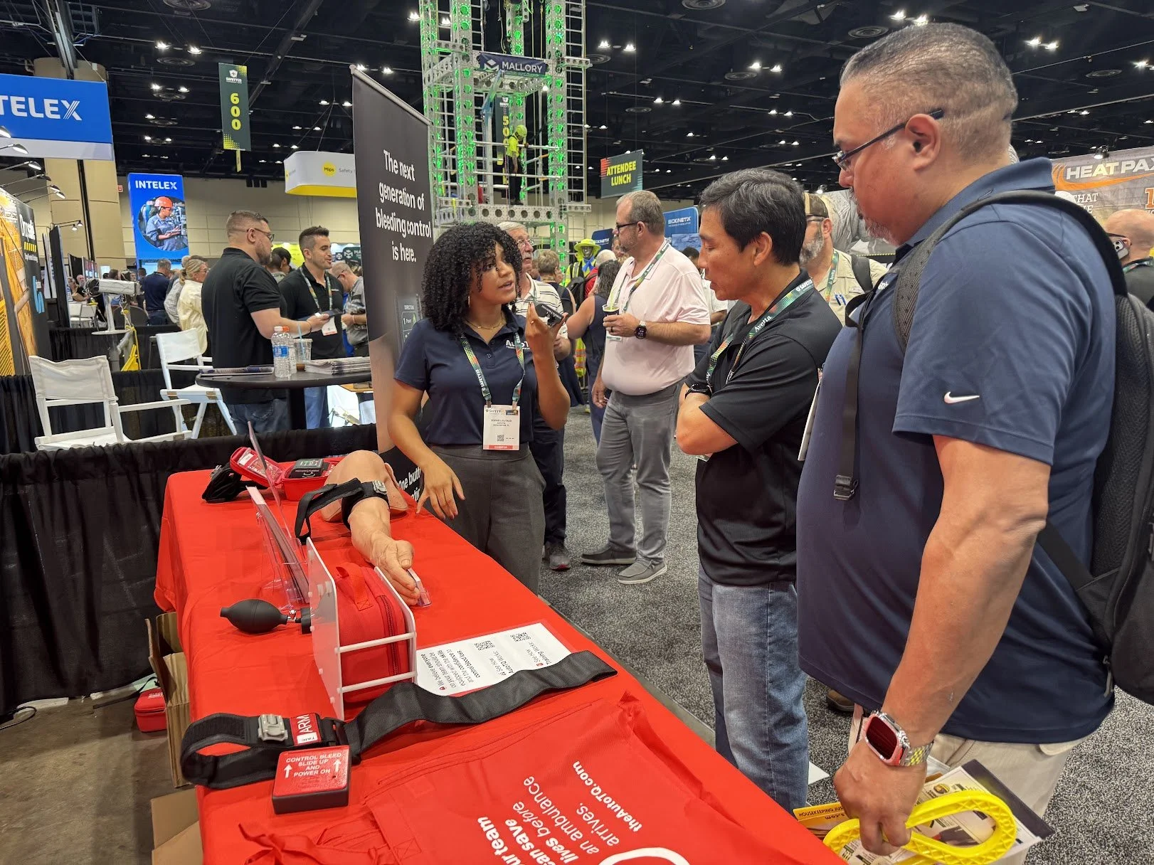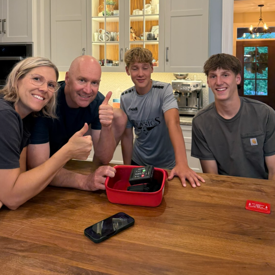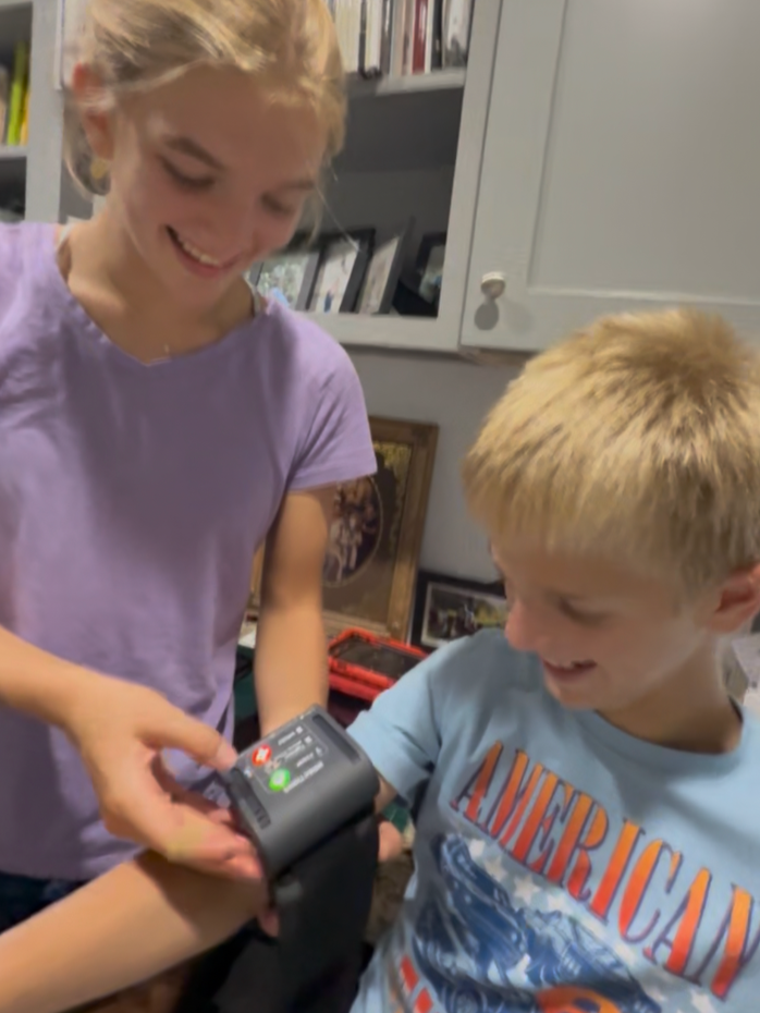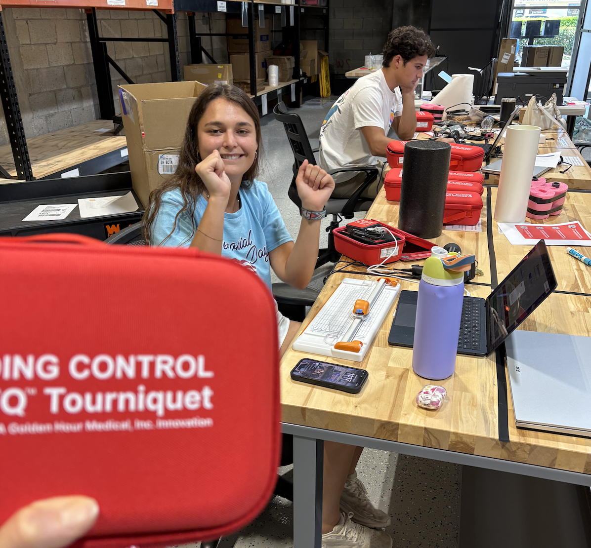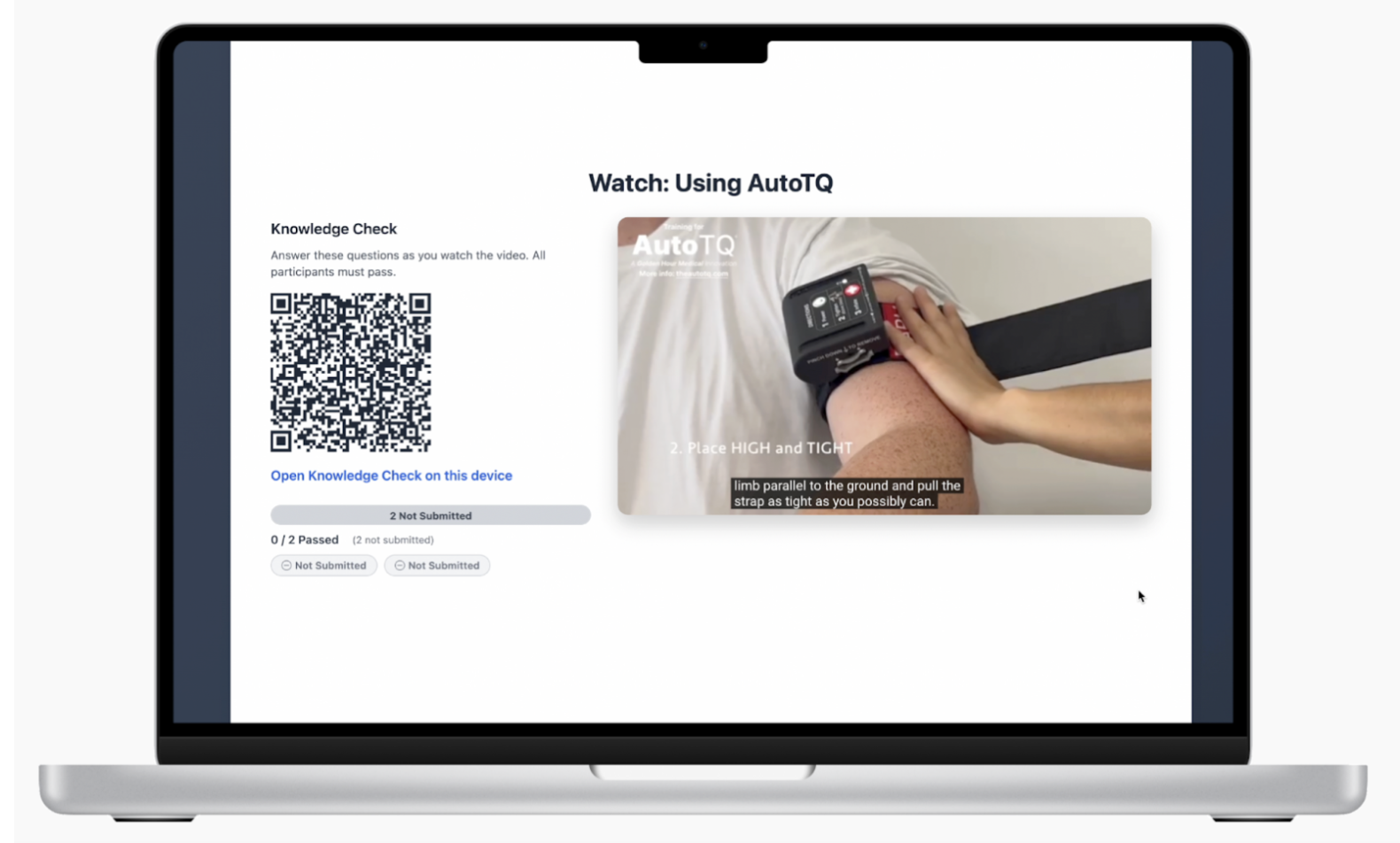 Press the power button to unmute instructions, and apply the tourniquet to your buddy.